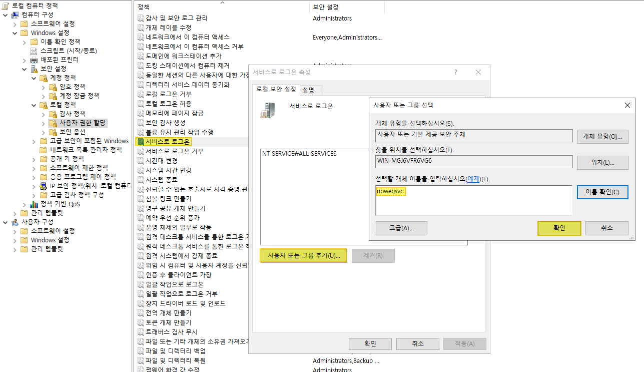 'nbwebgrp' 그룹 생성 후 'nbwebsvc' 계정을 멤버로 추가하였음에도 오류가 발생될 때 아래와 같이 그룹정책 수정으로 조치